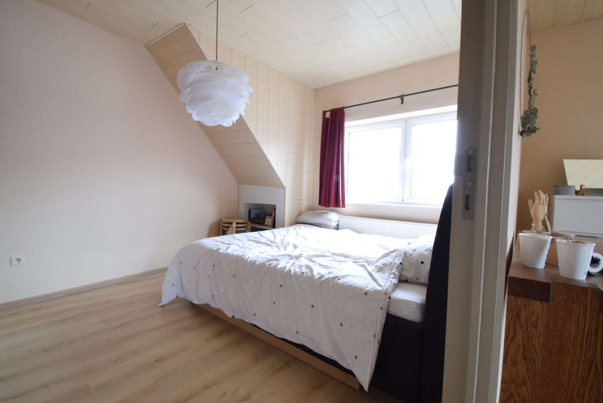 Verder is er een ruime slaapkamer met veel lichtinval, laminaat en aanpalend een badkamer met douche, lavabo en toilet.