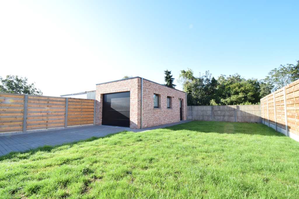 In de tuin staat een grote garage met elektrische poort, de tuin wordt aangelegd let gazon.
