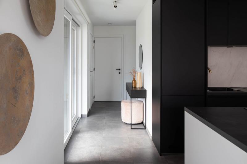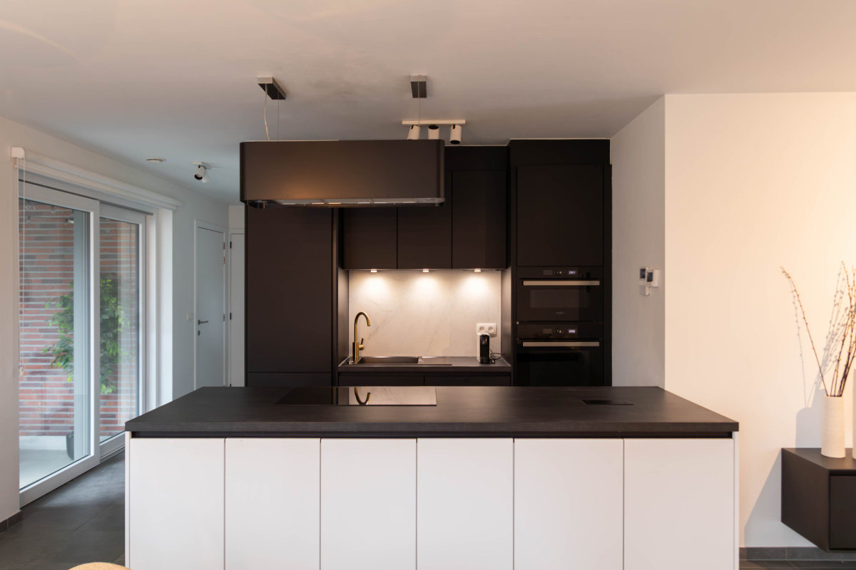 De inkomhal leidt naar een leefruimte met veel lichtinval en een mooi open zicht op de Onze-Lieve-Vrouwkerk. Aansluitend bevindt zich de volledig uitgeruste open keuken met kwalitatieve toestellen (inductiekookplaat, spoelbak, koelkast, diepvries, combi-oven, vaatwasser, …). Via het schuifraam bereikt u het aangename, overdekte terras waar u het hele jaar door kan genieten.