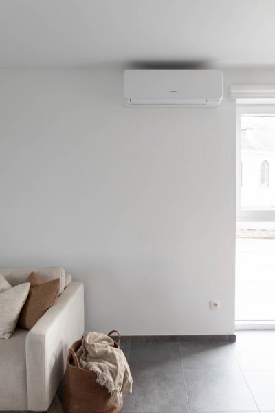 De leefruimte is uitgerust met een warmtepomp die zowel kan verwarmen als koelen.