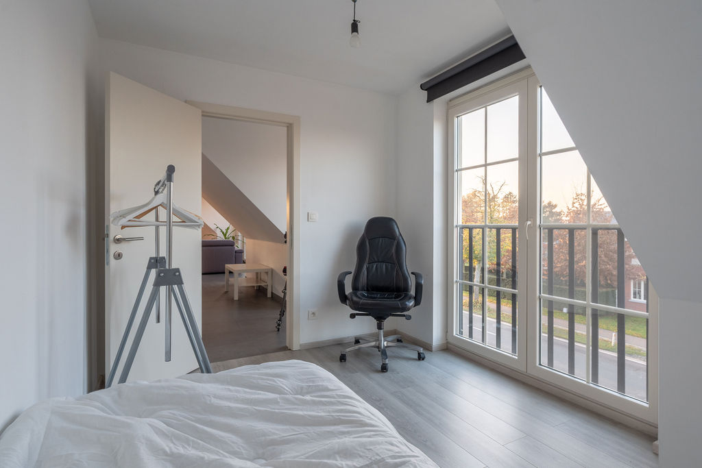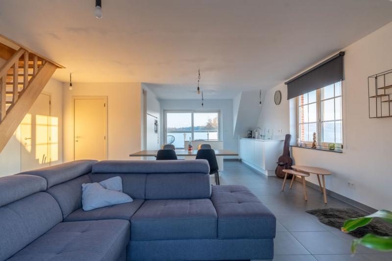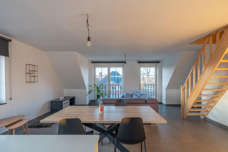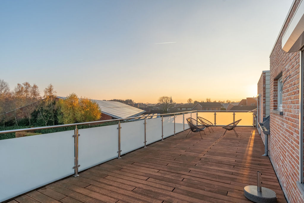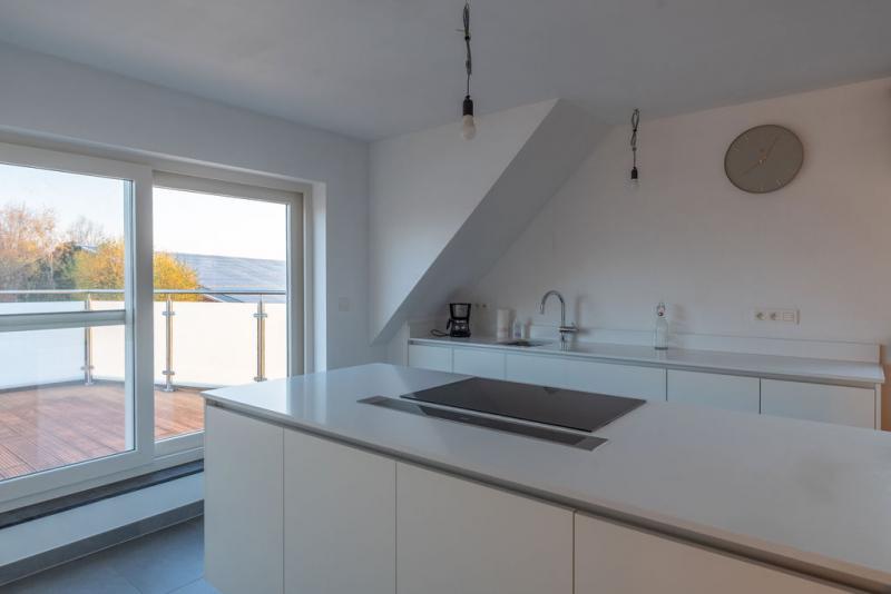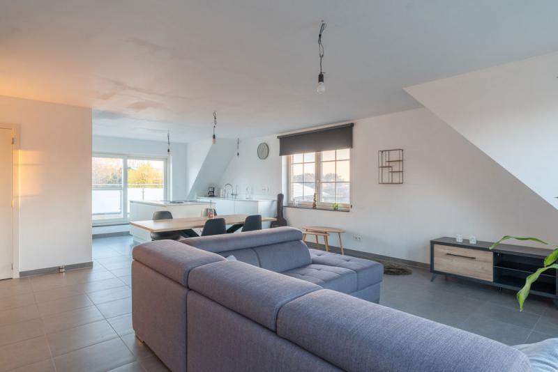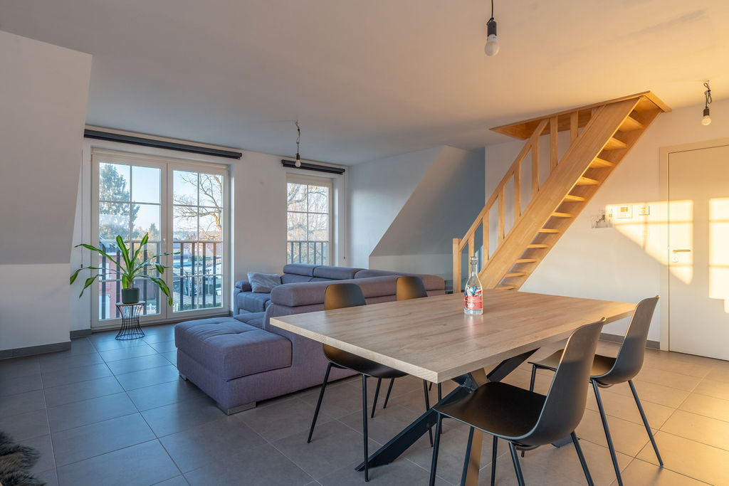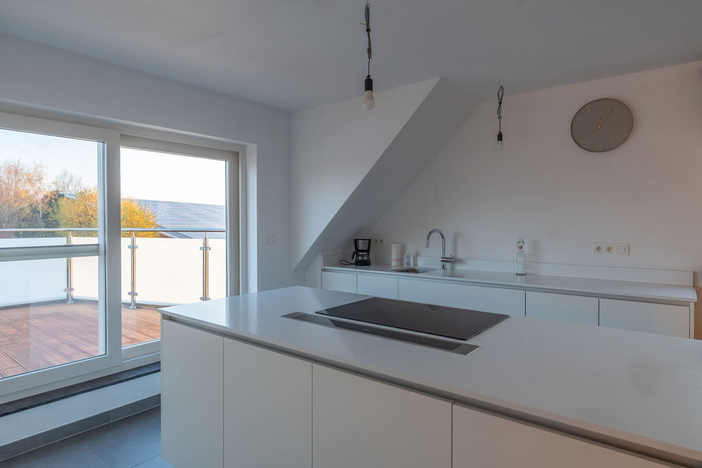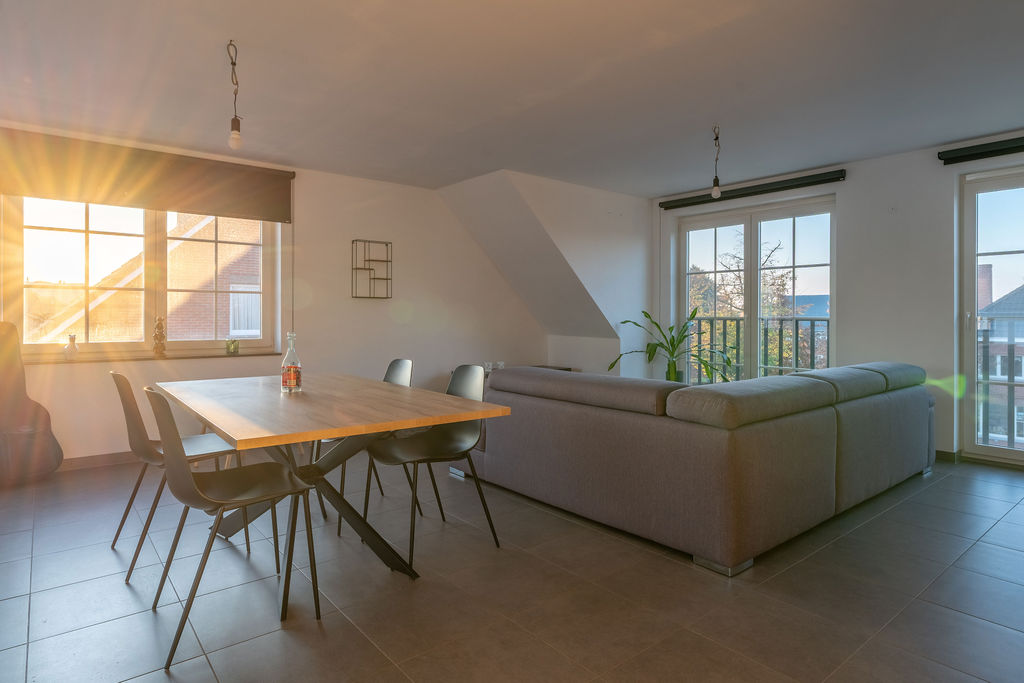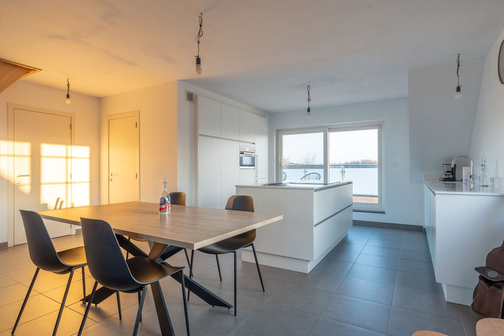 Het dakappartement bestaat uit een lichtrijke leefruimte met een zithoek vooraan, een eethoek en een open keuken met aanpalende berging achteraan. De keuken geeft uit op het groot dakterras met mooi uitzicht op de groene omgeving en de weilanden achteraan.