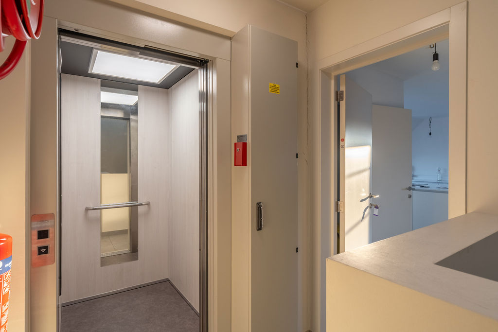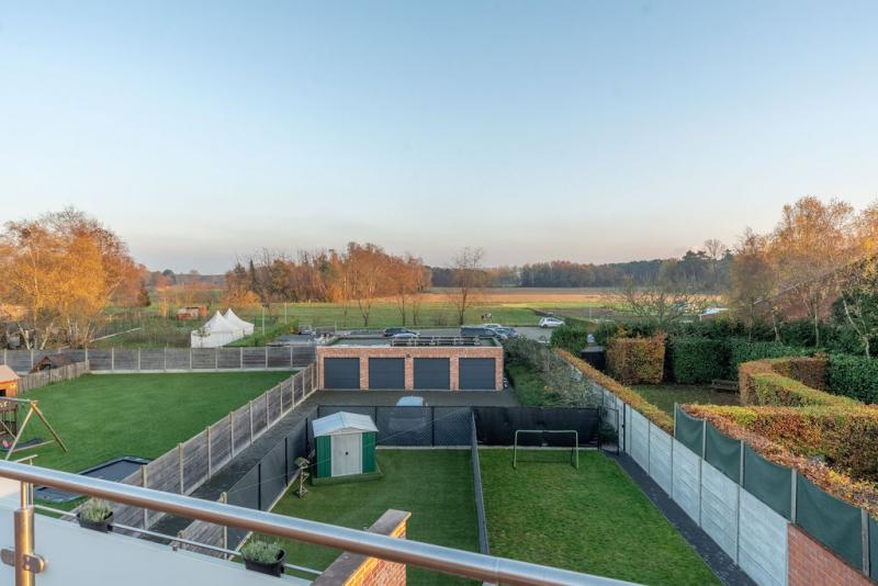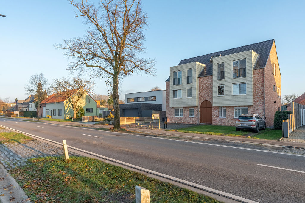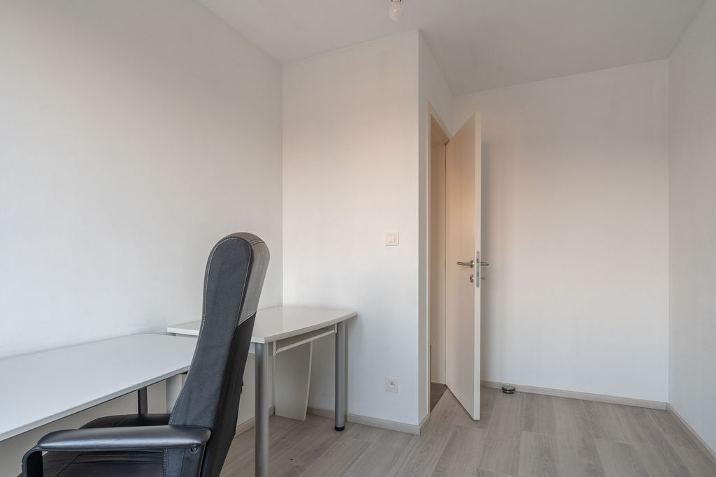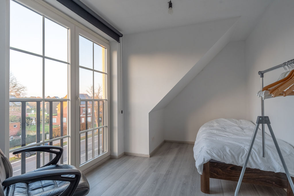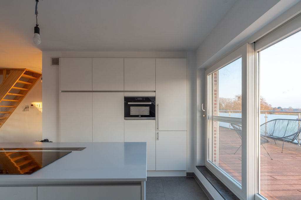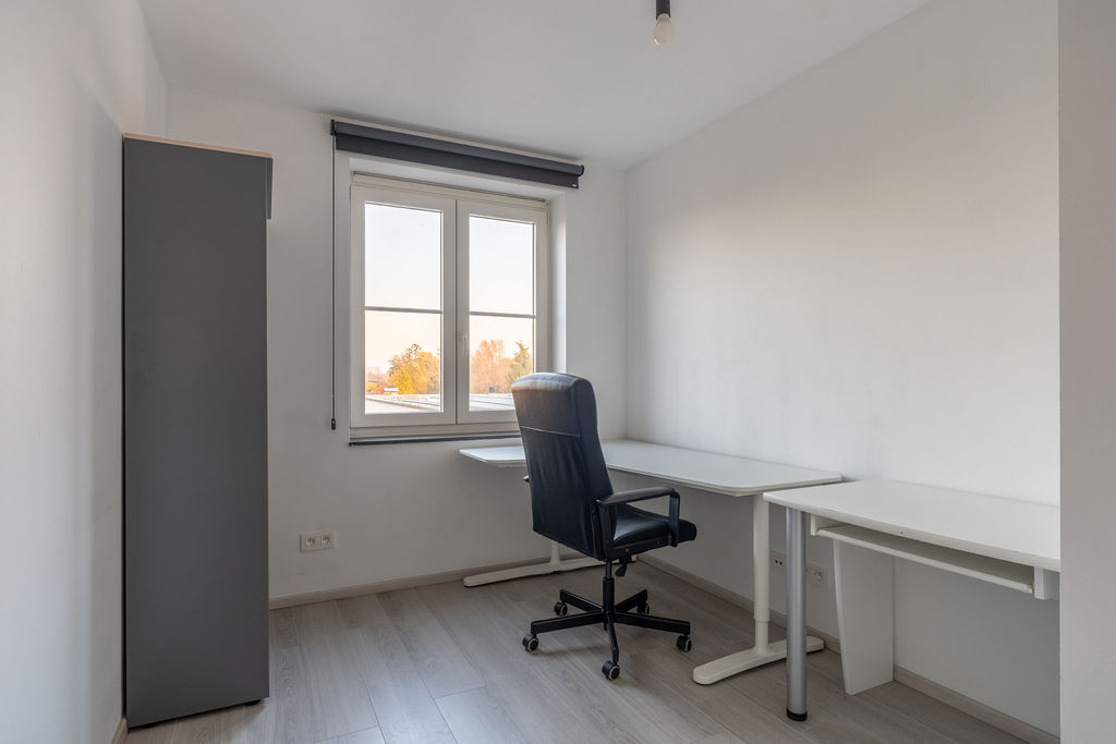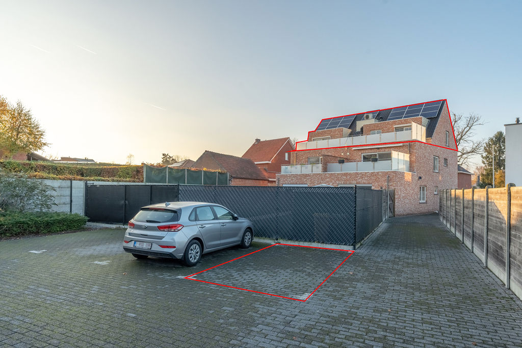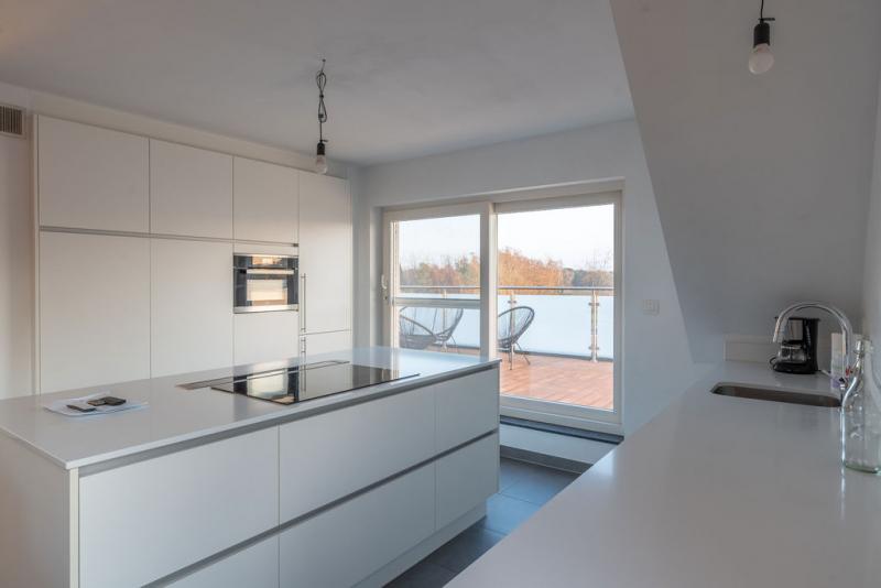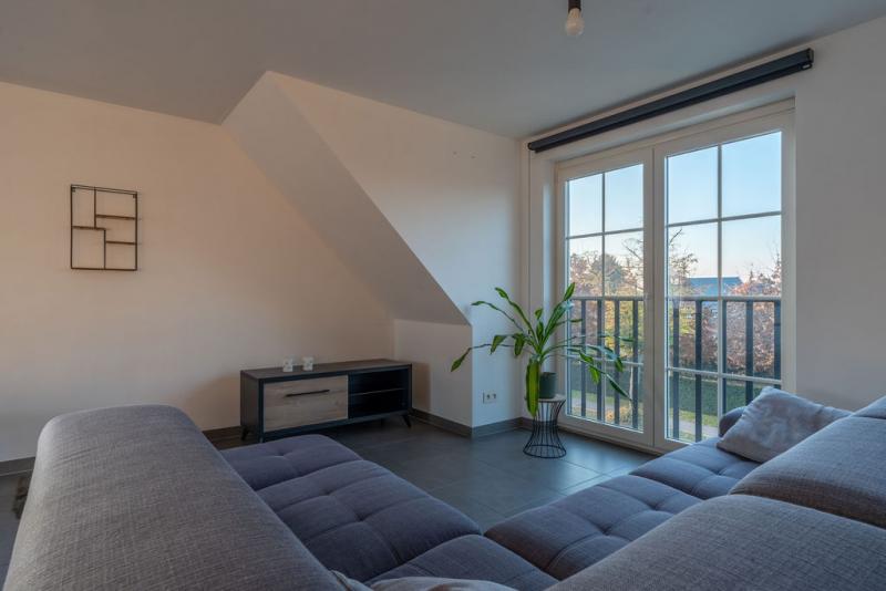 Het dakappartement bestaat uit een lichtrijke leefruimte met een zithoek vooraan, een eethoek en een open keuken met aanpalende berging achteraan. De keuken geeft uit op het groot dakterras met mooi uitzicht op de groene omgeving en de weilanden achteraan.