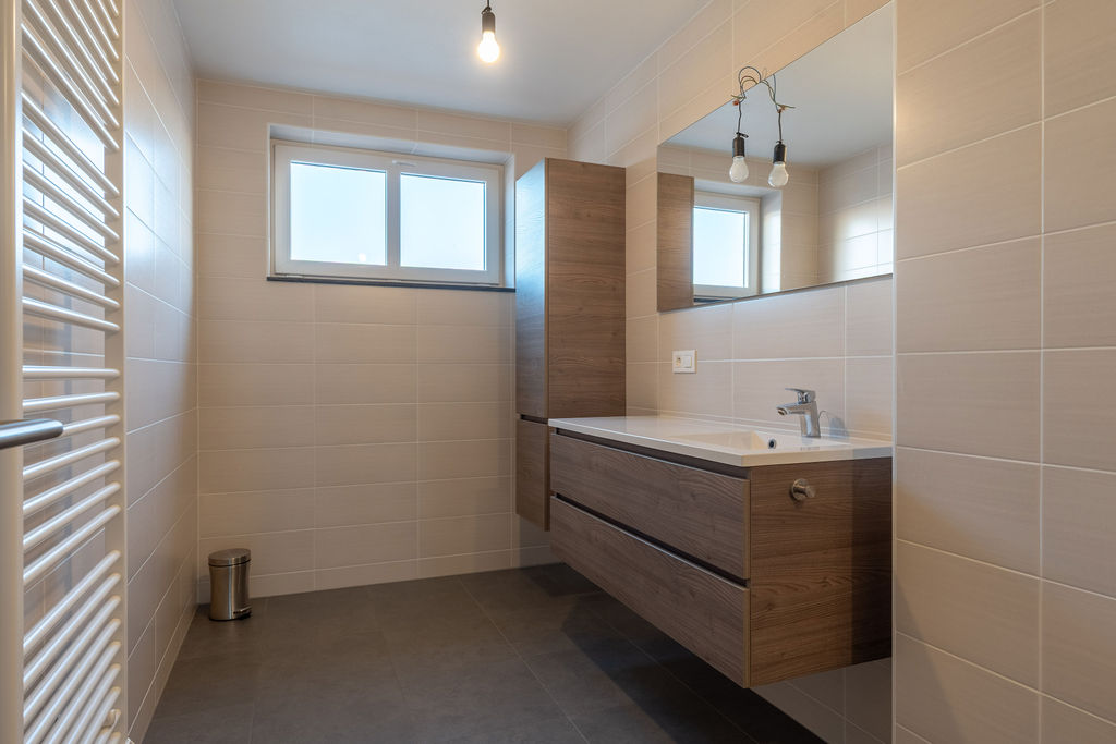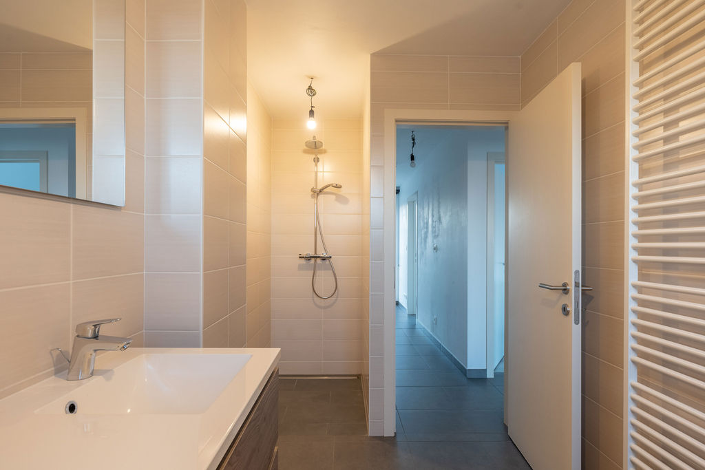 Badkamer 1  7,56 mēBadkamer met grote inloopdouche, lavabomeubel. Tegen de muur is een handdoekdroger geplaatst.