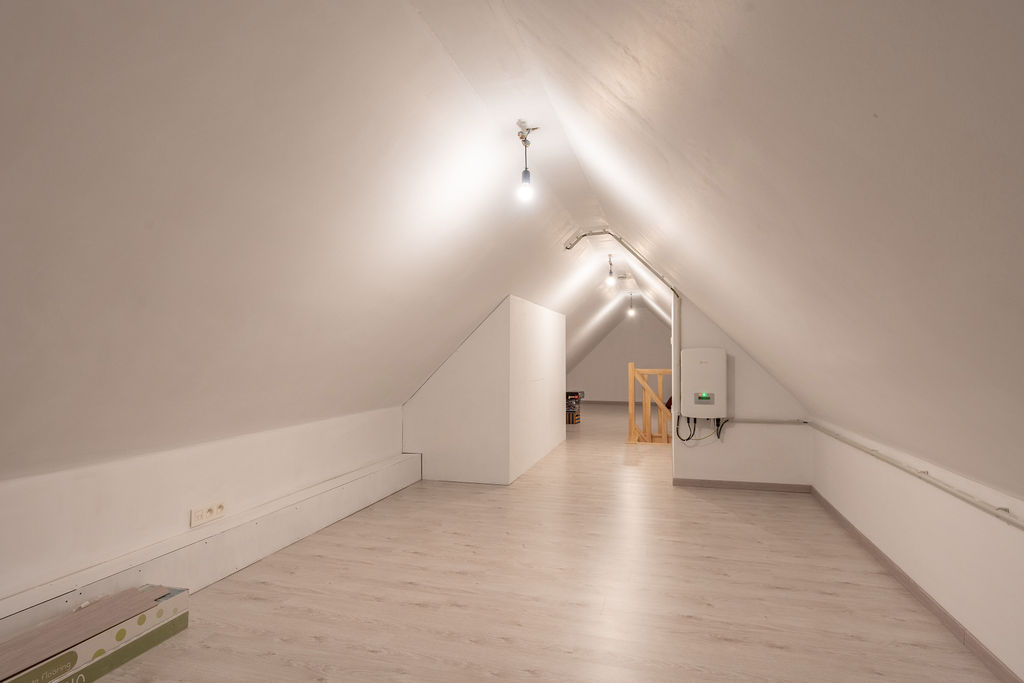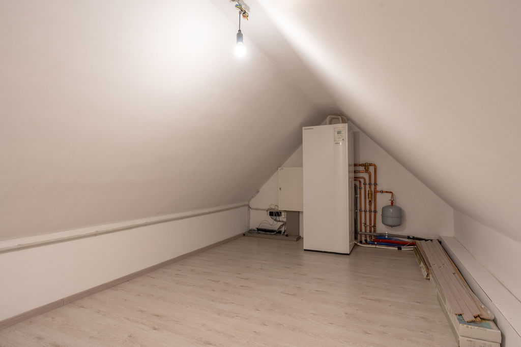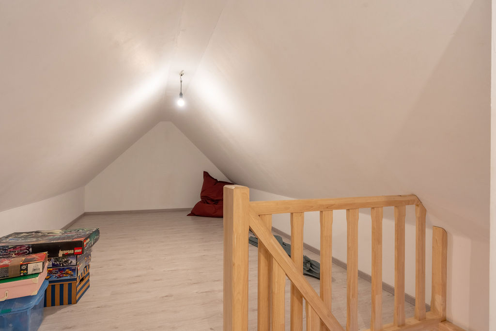 Vanuit de leefruimte is er een open houten trap naar de zolderverdieping, die momenteel dienst doet als bergruimte, hier is ook de warmtepomp geplaatst. De zolderverdieping is potentieel interessant als extra berging, speelkamer, hobbyruimte, ... .