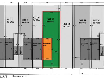 •Lot 10, halfopen bebouwing, is 406m² groot met een straatbreedte van 11,20 meter en een bouwbreedte van 6,20 meter.