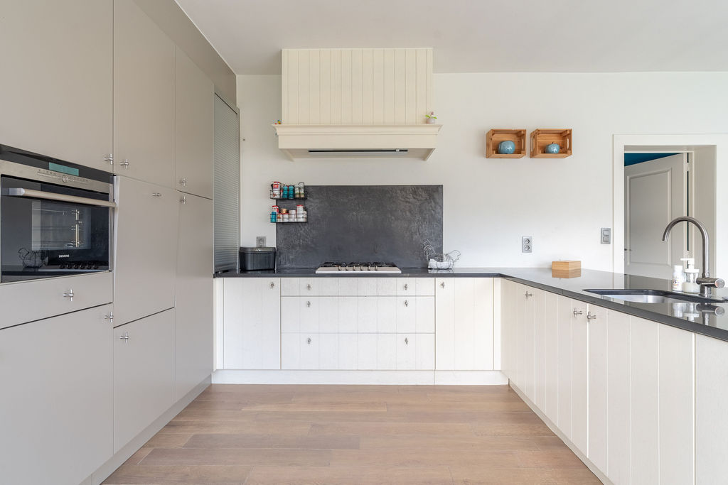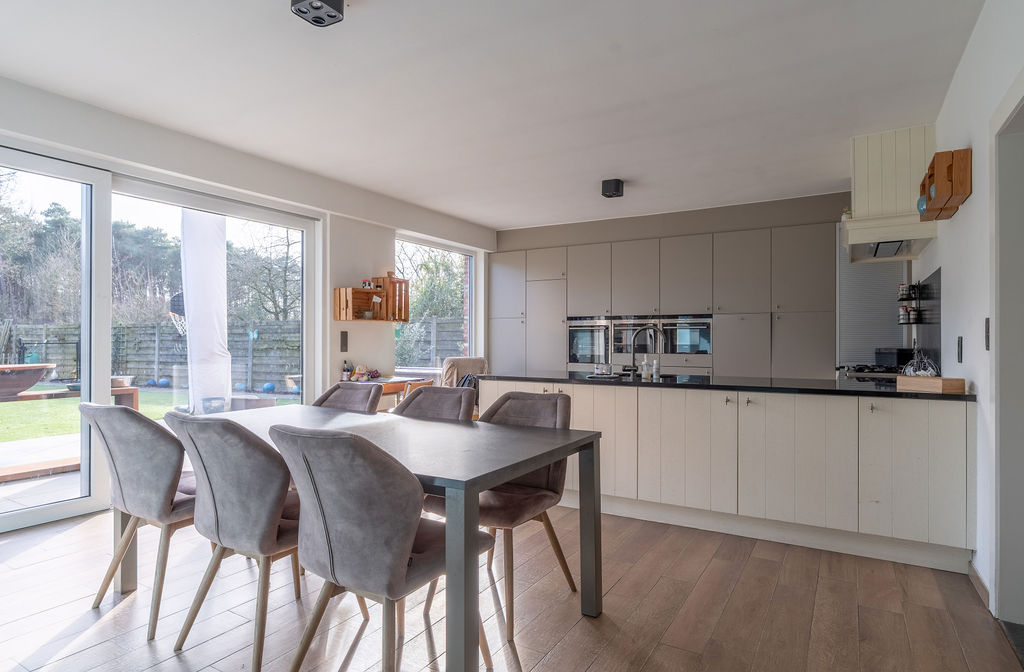 | Keuken 1 | 22,50 mē | Leefkeuken bestaande uit een eethoek en een volledig ingerichte keuken met pompsteen, afzuigkap, gasfornuis, micro-golf, oven, stoomoven, inbouwijskast. De keuken geeft via een schuifraam uit op het terras en de tuin. |