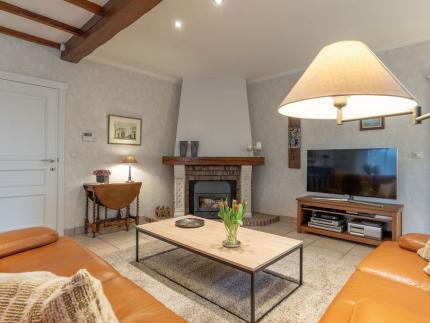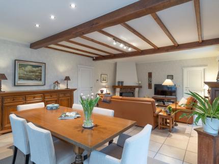 De inkomhal geeft uit op een ruime gezellige woonkamer met vooraan een salon en achteraan een eethoek, aan de straatzijde is een bureauruimte met ingemaakte kasten. De leefruimte geeft via een schuifraam uit op het deels overdekte terras met zonneluifel.