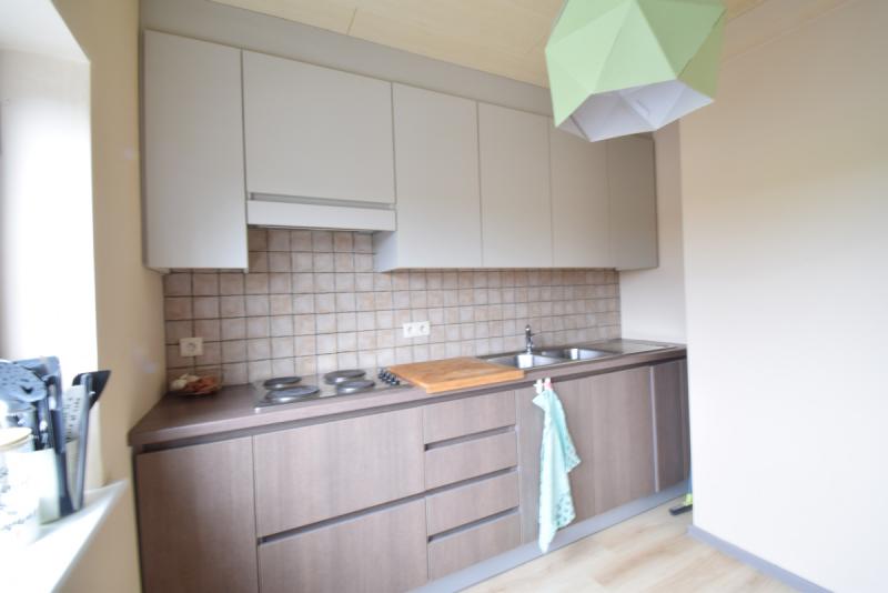 Het appartement is 55mē groot en als volgt ingedeeld: woonkamer met aanpalend een keuken die volledig is ingericht (fornuis, oven, vaatwasser, ...).