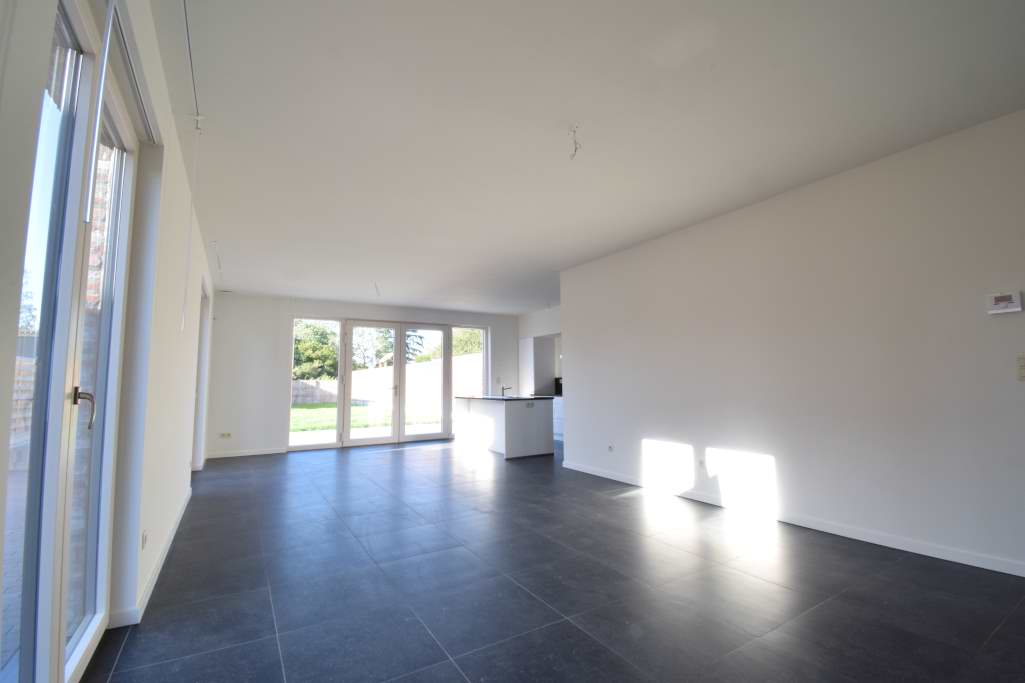 | Living | 48.01 mē | Ruime leefruimte met zithoek, eethoek en open keuken op keramische tegel, door de ramen vooraan en het groot raam in de zij- en achtergevel is deze ruimte zeer helder door de veel lichtinval. |