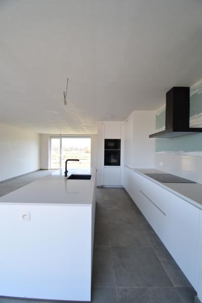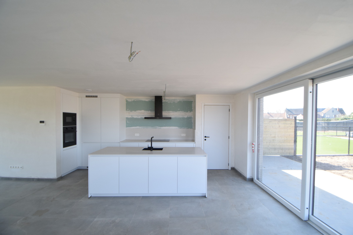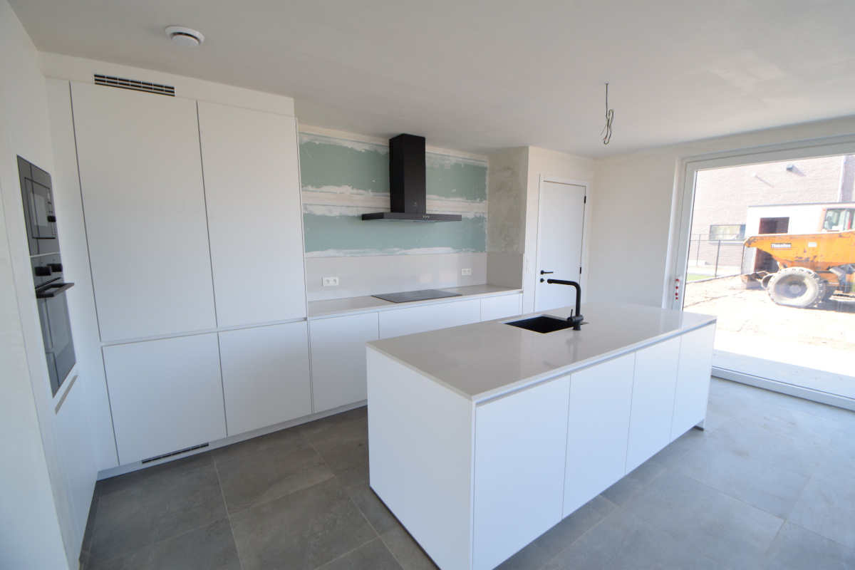 De open keuken met eiland is volledig ingericht en voorzien van alle comfort: inductiefornuis, vaatwasser, combi-oven, spoelbak, inbouwijskast, en voldoende kastruimte. Aanpalend is er een ruime berging met aansluiting voor wasmachine- en droogkast.