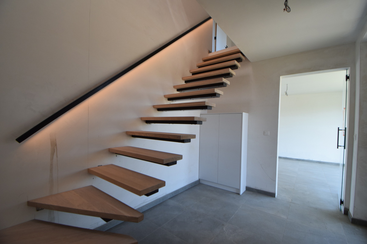 De mooie zwevende houten trap brengt je naar de bovenverdieping. Boven is er ter hoogte van de tuinzijde een master bedroom met veel lichtinval en mogelijkheid tot dressing. Verder zijn er twee ruime kinderkamers, een apart toilet in de nachthal en een moderne badkamer met douche, ligbad en dubbel lavabomeubel.