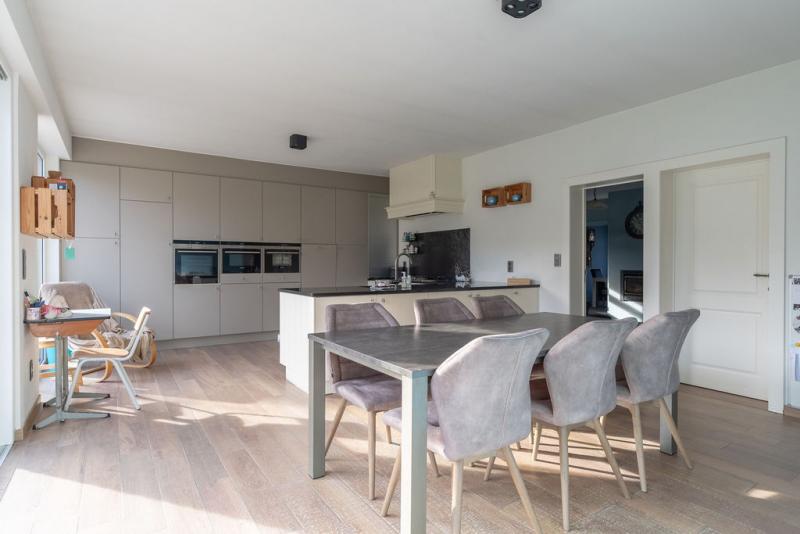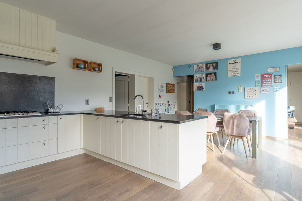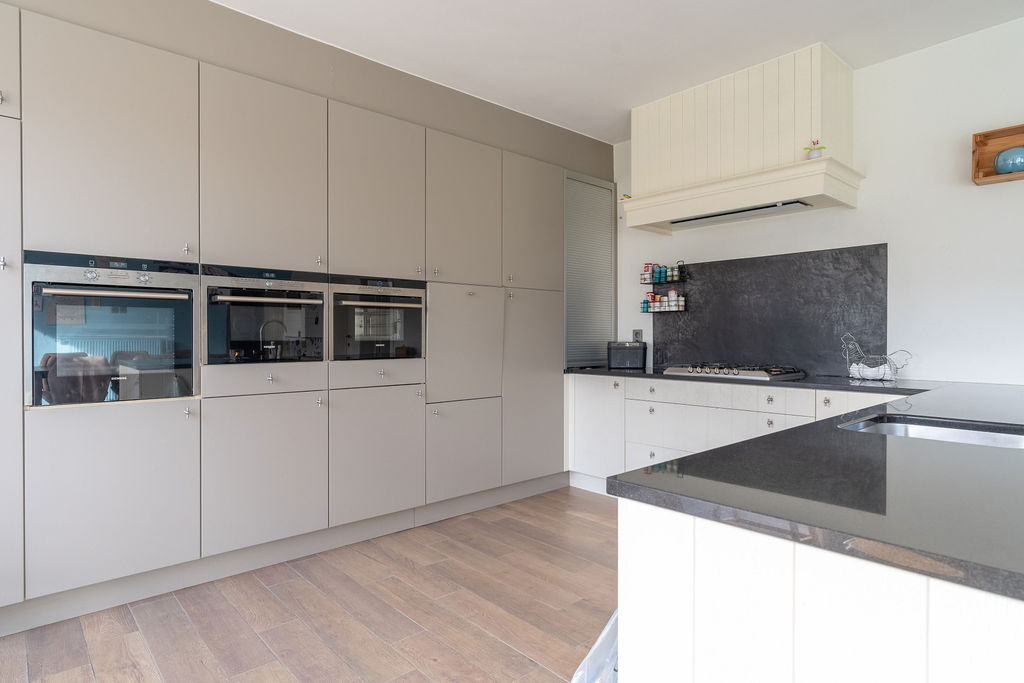 | Keuken 1 | 22,50 mē | Leefkeuken bestaande uit een eethoek en een volledig ingerichte keuken met pompsteen, afzuigkap, gasfornuis, micro-golf, oven, stoomoven, inbouwijskast. De keuken geeft via een schuifraam uit op het terras en de tuin. |
