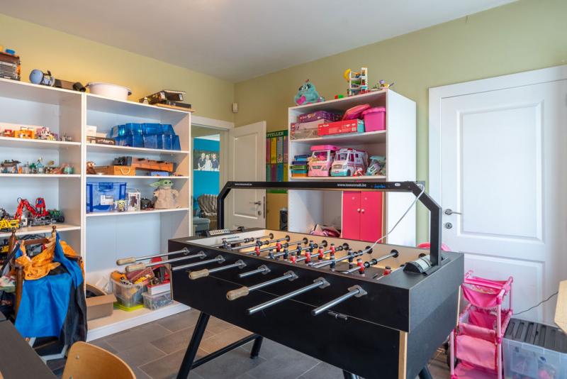 De indeling is als volgt: Inkomhal met aanpalend een bureauruimte (eventueel 7de slaapkamer), de inkomhal geeft uit op de leefruimte bestaande uit een zitplaats vooraan en aanpalend een zithoek met aansluiting voor een houtkachel. De zithoek geeft uit op de leefkeuken achteraan met zicht op de tuin. De leefkeuken bestaat uit een ruime volledig ingerichte keuken, eethoek en een 2de zithoek/ speelkamer. Keuken en speelkamer geven uit op een groot terras (deels overdekt) en de tuin. Verder is gelijkvloers een badkamer met dubbel lavabomeubel en grote inloopdouche, een kleine wasruimte en een grote inpandige garage.