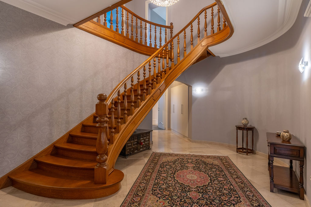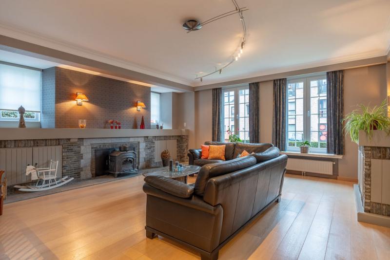 Bij het betreden van de villa wordt u verwelkomd in een imposante inkomhal die meteen indruk maakt met haar prachtige houten trap naar de bovenverdieping. Aanpalend is er een vestiaire en een gastentoilet met handenwasser. De inkomhal geeft uit op een ruime leefruimte bestaande uit zithoek met houtkachel en eetkamer die warmte en klasse uit stralen en is afgewerkt met massief parket, wat perfect aansluit bij het authentieke karakter van de woning.