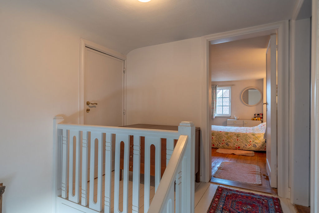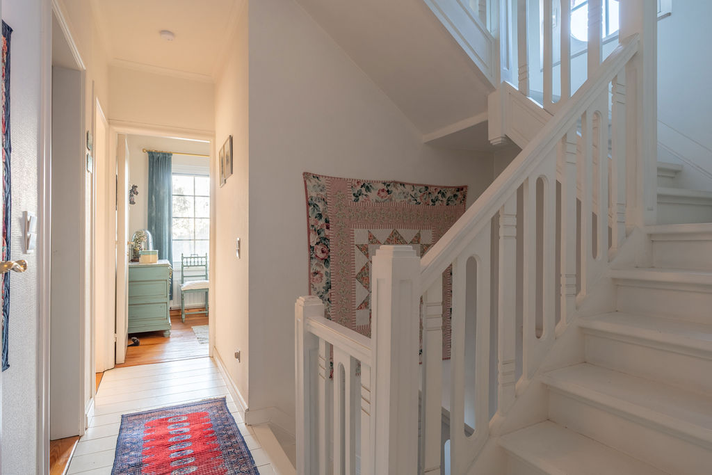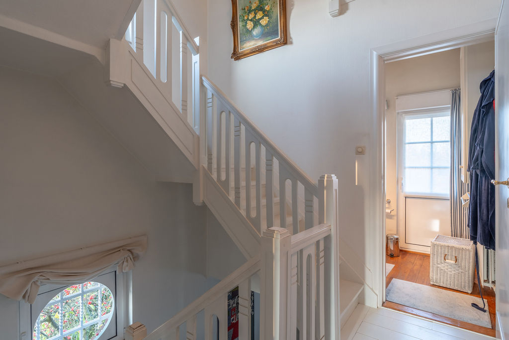 | Inkomhal | 13,20 m² | Ruime inkomhal met wit geschilderde houten trap naar de bovenverdieping. De inkomhal geeft uit op de woonkamer vooraan en de eetkamer achteraan. |