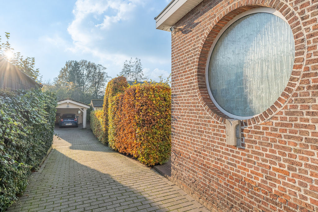 De tuin is afgesloten met een elektrische poort en achteraan in de tuin staat een carport en tuinhuis.
