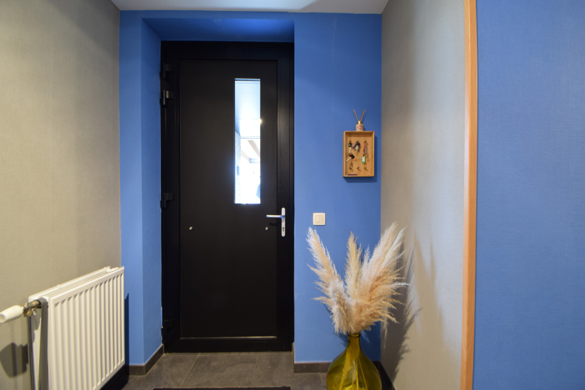 Bij binnenkomst word je verwelkomd in een inkomhal met gastentoilet, vestiaire en trap naar de bovenverdieping. De hal leidt naar de leefruimte met een gezellige zit- en eethoek. Achteraan bevindt zich de volledig uitgeruste keuken, voorzien van alle moderne toestellen en aanpalend een praktische koele berging.