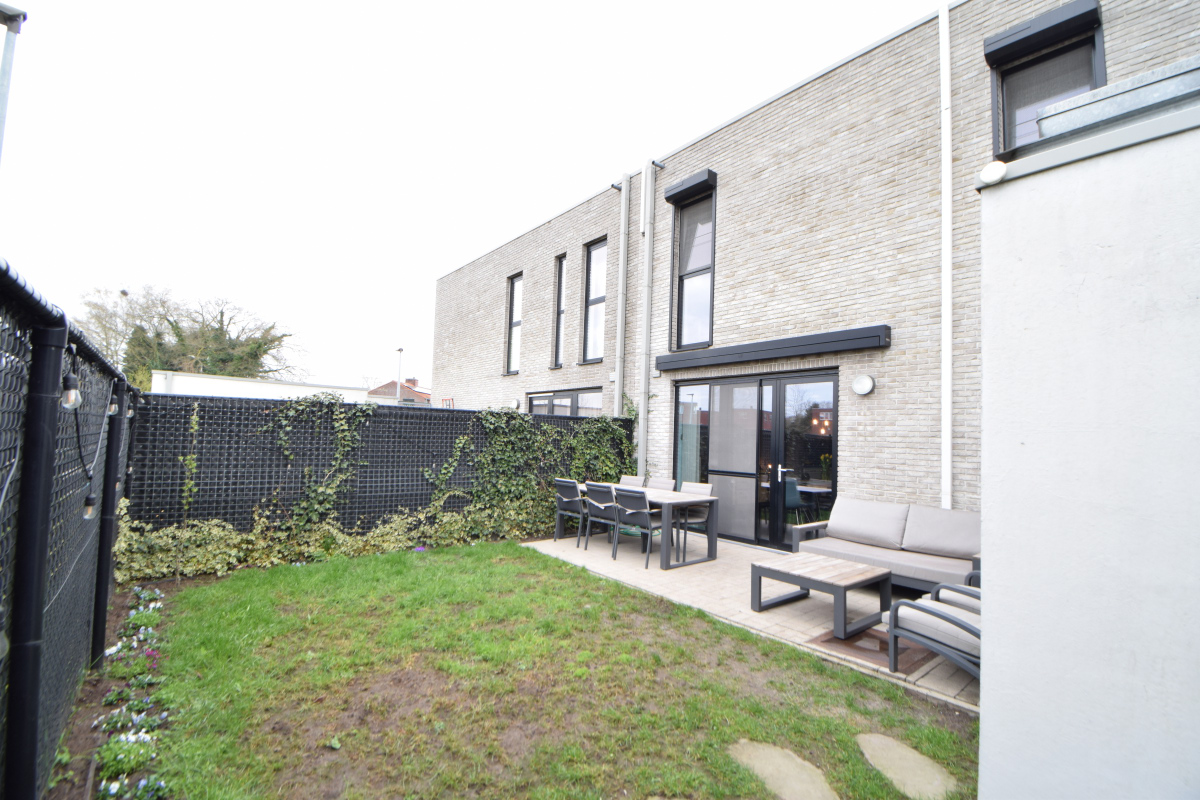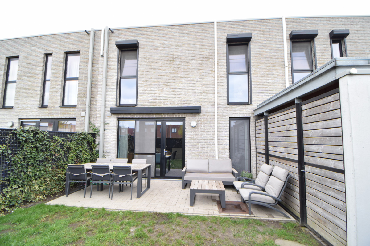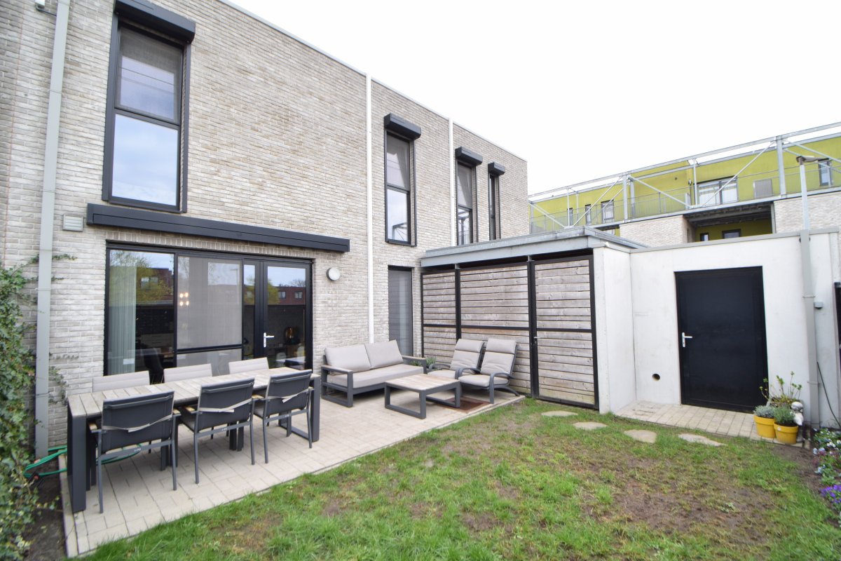Ter hoogte van de keuken is er een dubbele achterdeur die uitgeeft op het terras en de omheinde, onderhoudsvriendelijke tuin met achterpoortje. Een zonneluifel zorgt voor extra comfort op warme dagen en de tuinberging biedt handige opbergruimte.