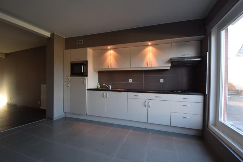 De inkomhal met apart gastentoilet geeft uit op de grote leefruimte met zithoek, eethoek en open keuken. De keuken is ingericht met fornuis, afzuigkap, oven en inbouw ijskast. De keuken geeft uit op het dakterras achteraan.