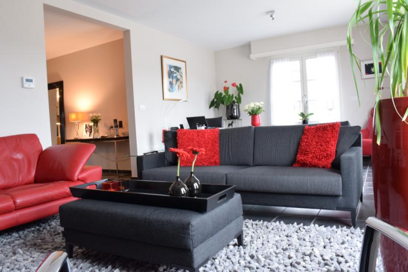 Achteraan een ruime woonkamer die uitgeeft via een dubbel opengaand raam op het dakterras met mooi uitzicht dat de ganse dag baadt in het zonlicht.