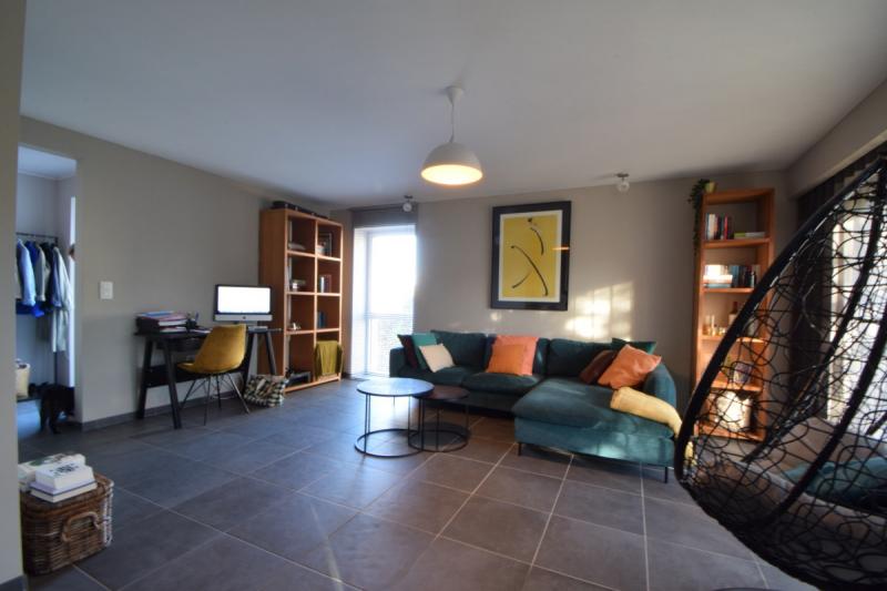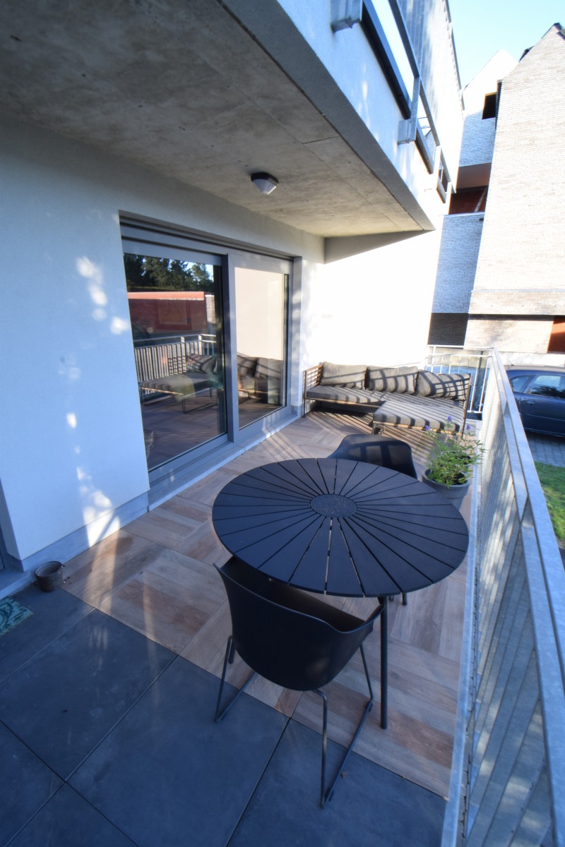 Het appartement bestaat uit een inkomhal met een pivoterende glazen deur naar de ruime woonkamer met aanpalende keuken en eethoek. De leefruimte geeft via een schuifraam uit op het terras achteraan. Het terras is deels overdekt. Via een trap kan je naar de tuin.