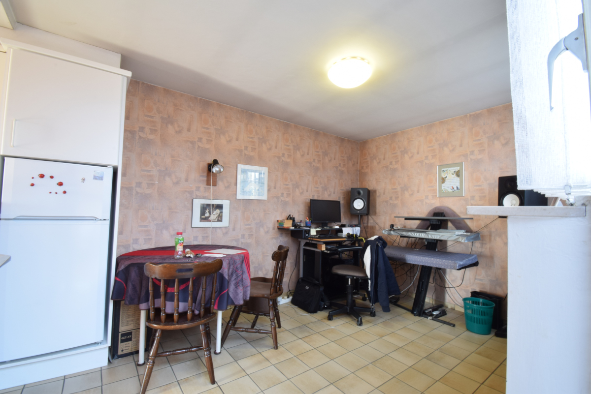 Woning met 3 slaapkamers, garage en tuin op ca. 143mē.Ideale starterswoning bestaande uit een inkomhal met gastentoilet en vestiaire. De inkomhal geeft uit op een woonkamer en op de ingerichte keuken met eethoek achteraan.